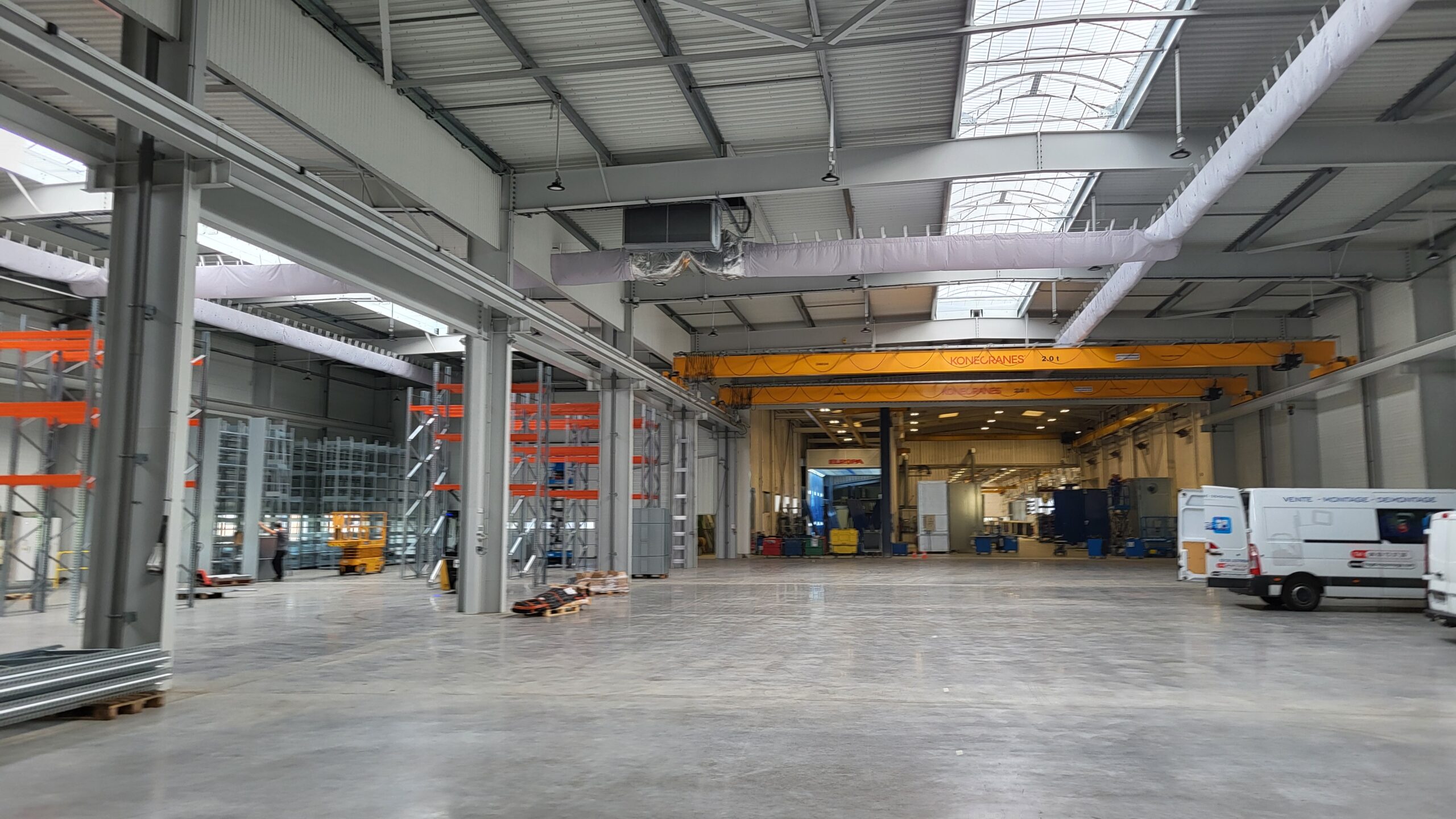 Le projet comprend des travaux de terrassement, voiries et réseaux divers, ainsi que des fondations profondes réalisées par inclusions rigides. La structure repose sur une charpente métallique PRS, habillée d’un bardage double peau avec 110 mm d’isolation en laine de roche, et d’une couverture multicouche isolée à 130 mm. Le chauffage est assuré par un système thermodynamique réversible avec groupe extérieur en toiture et distribution par cassettes gainées. Le bâtiment intègre des menuiseries extérieures en aluminium avec double vitrage, ainsi que des portes sectionnelles motorisées. En toiture, 550 panneaux photovoltaïques assurent une production de 240 kWc, contribuant à la performance énergétique du site.